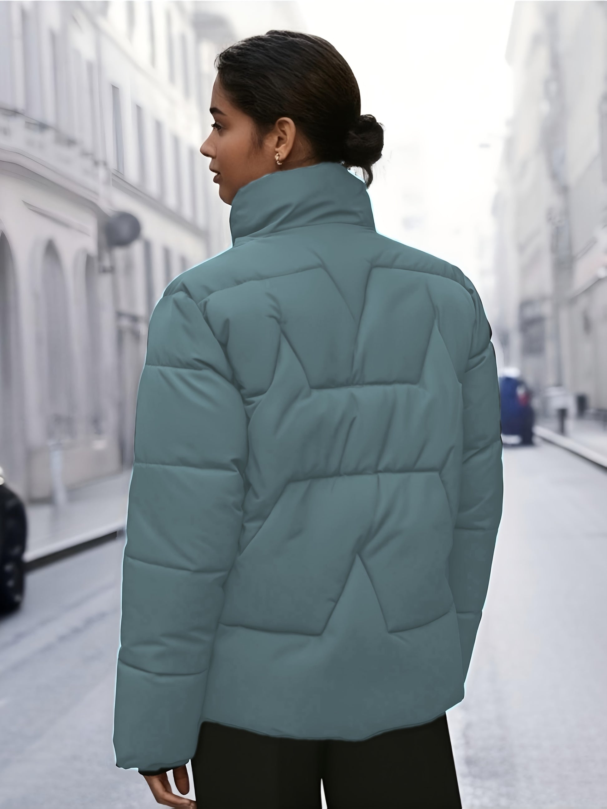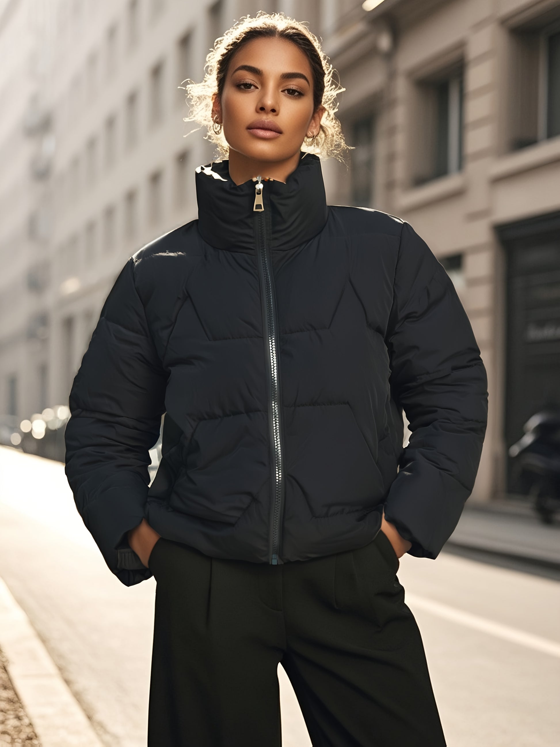 This puffer features a high, structured collar that adds a polished silhouette while offering protection against cool winds. The soft, lightweight padding keeps you warm without adding bulk, making it perfect for everyday wear — whether you’re walking through the city or heading to a weekend brunch.