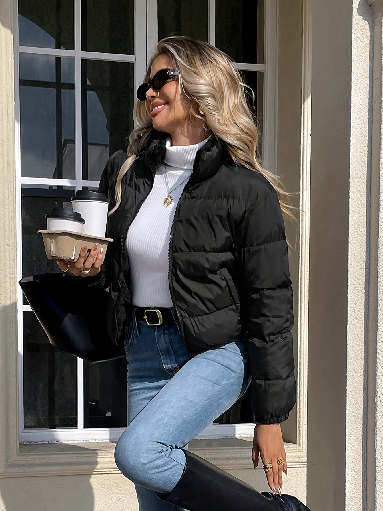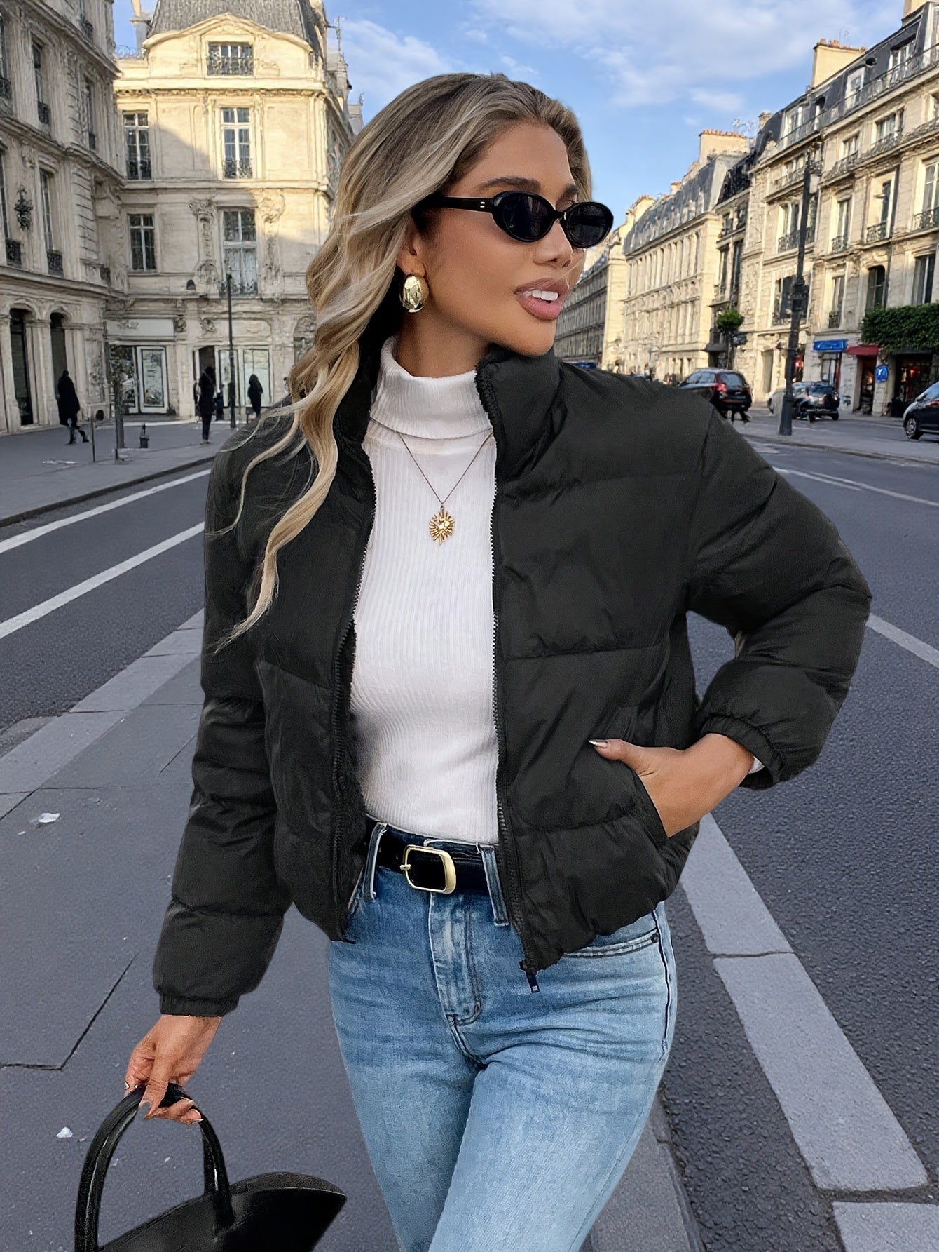 The high collar adds a refined, modern touch and shields from chilly breezes, while the cropped length makes it easy to pair with high-waisted denim, trousers, or athleisure looks. Minimal, versatile, and endlessly wearable — this is the jacket that elevates everyday dressing.